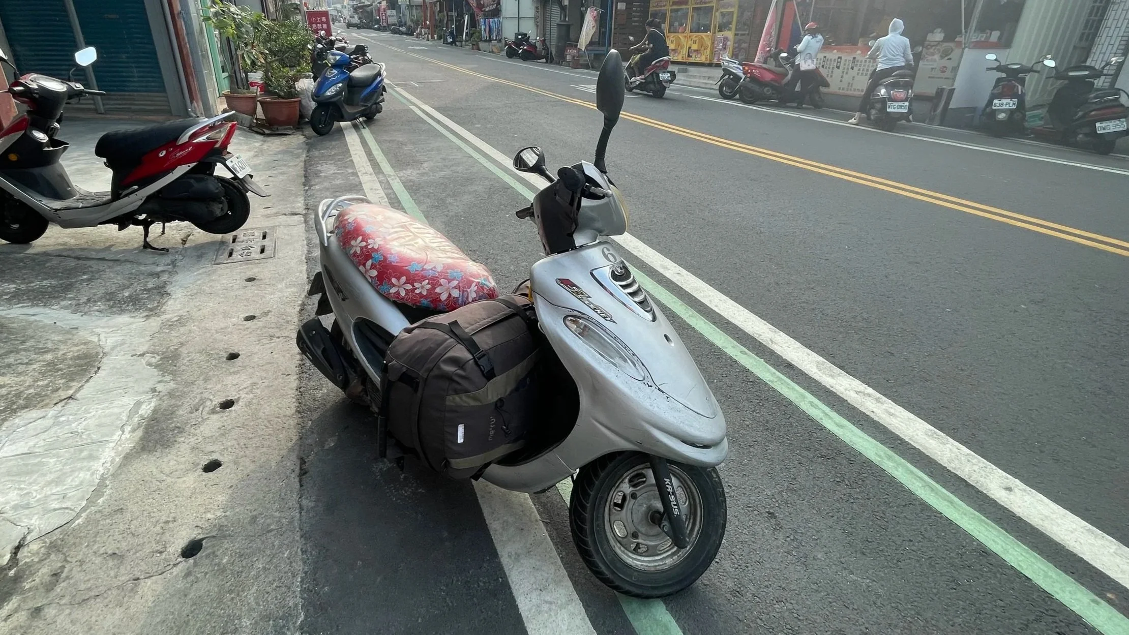 Und die kleine Insel gefällt mir sehr, gleich vom ersten Moment an, sie ist einfach total unaufgeregt. Die Rolleranmietung funktioniert problemlos, auch wenn ich den wahrscheinlich ältesten Roller der Insel bekomme. Mit einem ranzigen, faszinierend-hässlichen, rosa-roten Blümchen-Sitzbezug, der dann auch noch mit einer klebrigen Plastikfolie überspannt ist.