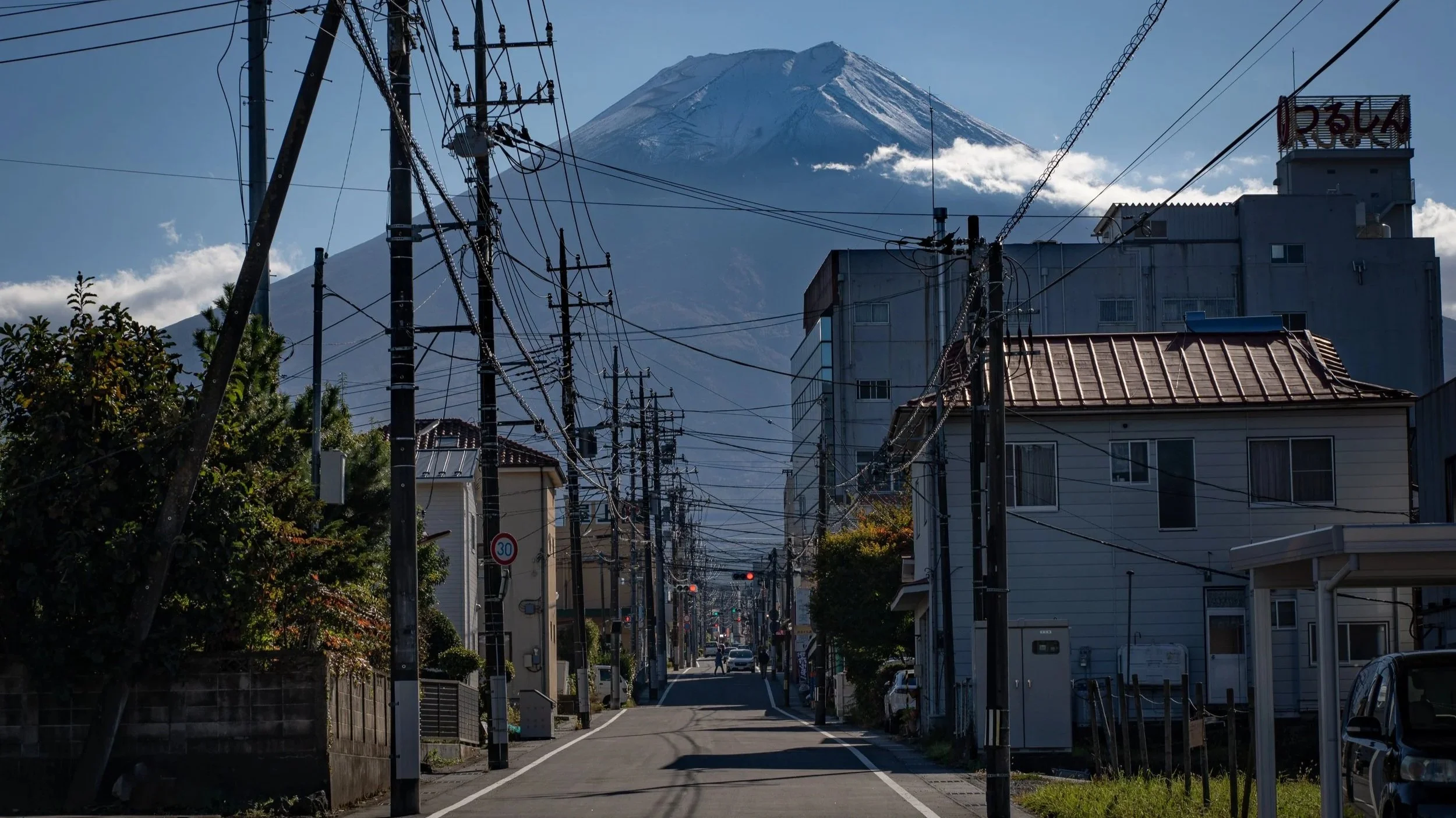 Fast noch schöner als den Blick mit der Pagode finde ich die Motive innerhalb von Fujiyoshida. Einige Hauptstraßen der Stadt laufen direkt auf den Fuji zu und bieten so tolle Möglichkeiten den Berg mit langer Brennweite zu portraitieren - und Bilder zu machen, die nicht jeder macht.