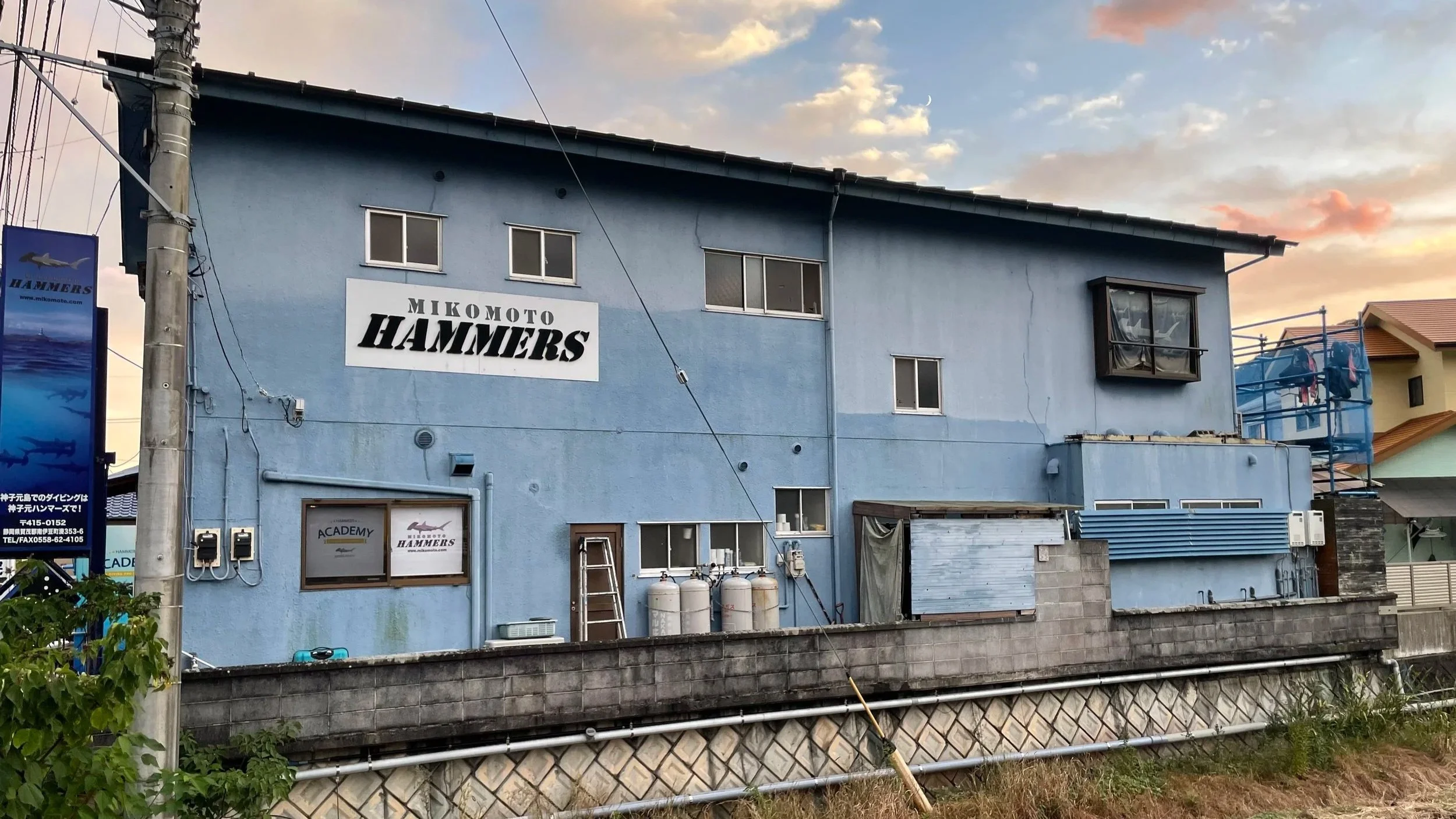 Auf der zwanzigminütigen Autofahrt zur Tauchbasis bekomme ich eine Druckbetankung zum Thema Tauchen in Japan und Tauchen mit Hammerhaien im Speziellen. Das alles in top Englisch und super interessant, super sympathisch. Fast schade, dass die Fahrt so schnell vorbei ist - aber wir sind angekommen. Angekommen bei den Mikomoto Hammers. So heißt die Tauchbasis, benannt nach der vorgelagerten Insel und der Hammerhai-Population, wegen der ich auch hier bin.