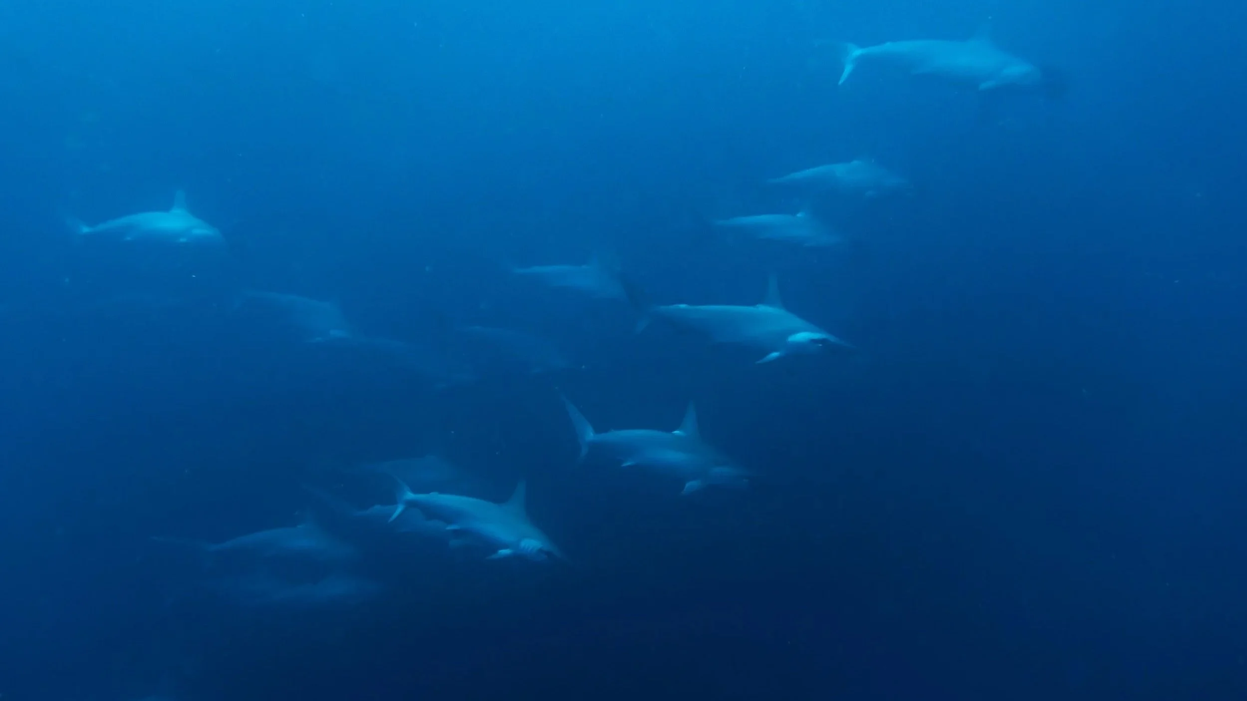 Das hatte auf meiner Reise bisher bestens funktioniert, auch mit den Schwarzbären im Yukon, den Grizzlies in Alaska und den Killerwalen auf Vancouver Island. Also verlasse ich mich auch hier voll und ganz auf die korrekte Situationsanalyse dieses vertrauenswürdigen Raubtiers - und auf die fehlerfreien Analysen aller anderen Hammerhaie dieses großen Schwarms. Es werden immer mehr, eine Gruppe, zwei Gruppen, drei Gruppen. 30 Tiere, 50 Tiere, 60 Tiere, ich höre auf zu überschlagen. Es bildet sich schließlich eine regelrechte Wand aus Hammerhaien. Und wir mitten drin. Ich kann mein Glück kaum fassen!