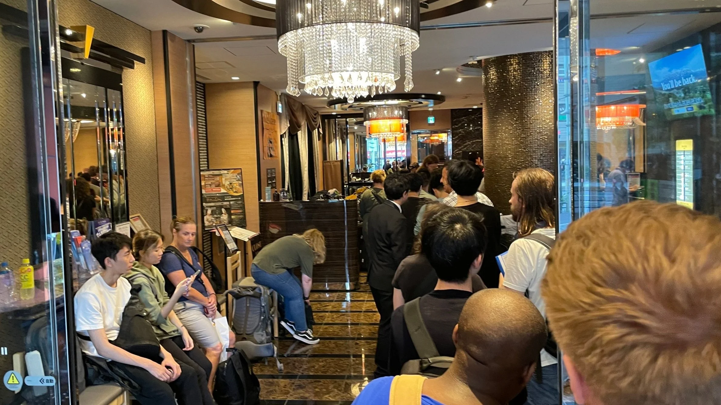 Checkin-Schlange im Hotel. Willkommen in Tokio.