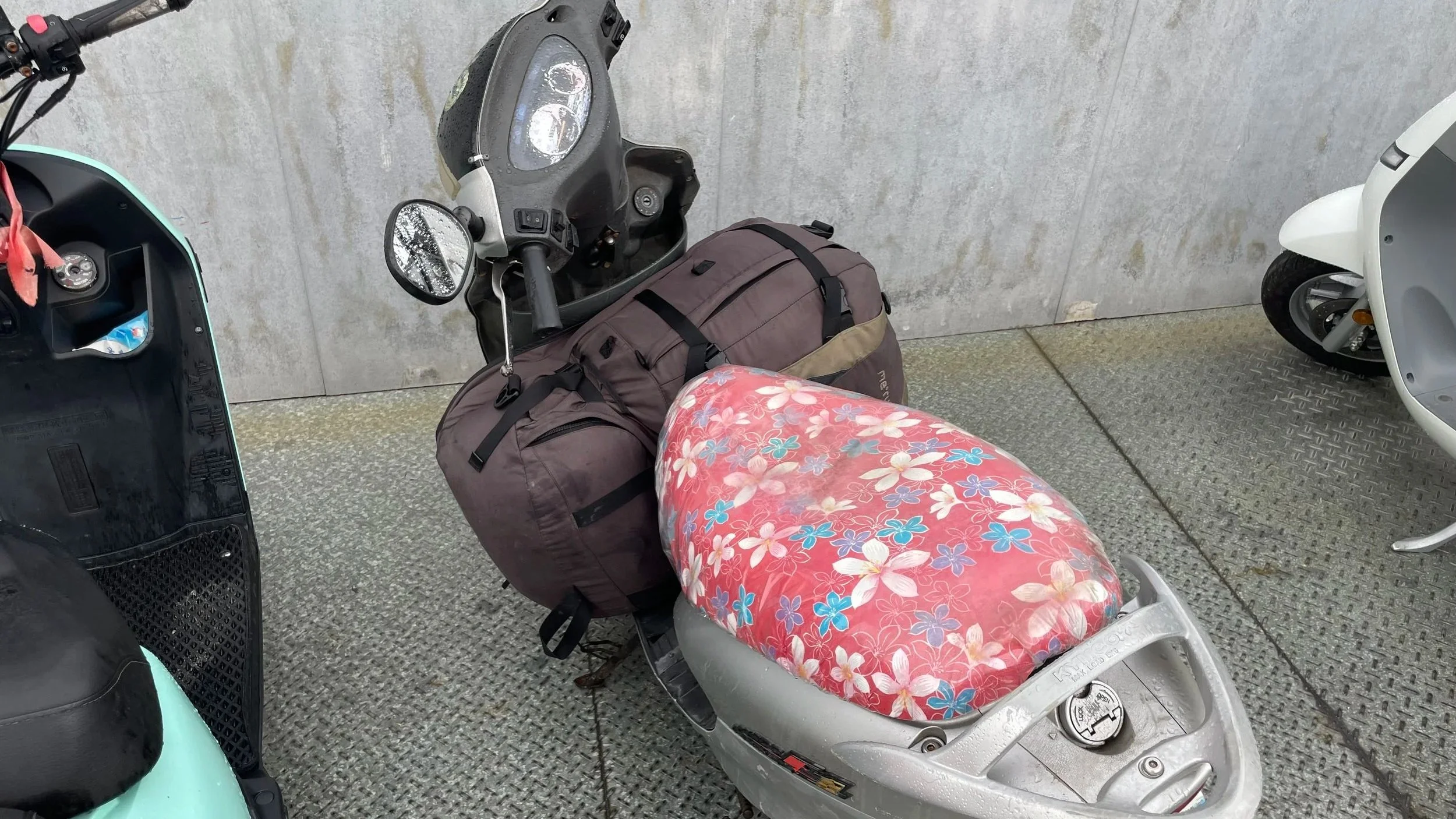 Auf Blümchen, meinem betagten Insel-Miet-Scooter, muss ich mich jetzt verlassen, ein weiteres, ein letztes Mal - und das unter Extrembedingungen.Mit meinem Mikrofaser-Reisehandtuch wische ich den Sitz trocken, dieses lieblich-schreckliche, rosafarbene Blümchen-Muster mit ranzigem Plastikbezug. Das Ergebnis stellt mich erstmal zufrieden. Beim Beladen dann, mit meinen 23kg und 12kg schweren Rucksäcken, bewundere ich noch Blümchens alte Reifen, mit diesem völlig runtergefahrenen Profil. Das Gummi erinnert eher an extra glatte Slicks für eine Rennstrecke, als an eine sichere Schlechtwetter-Option für die regennassen Straßen von Liuquiu.