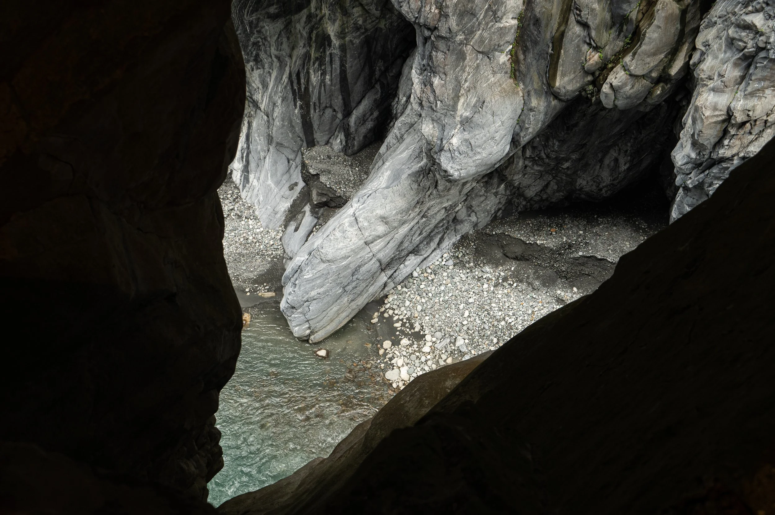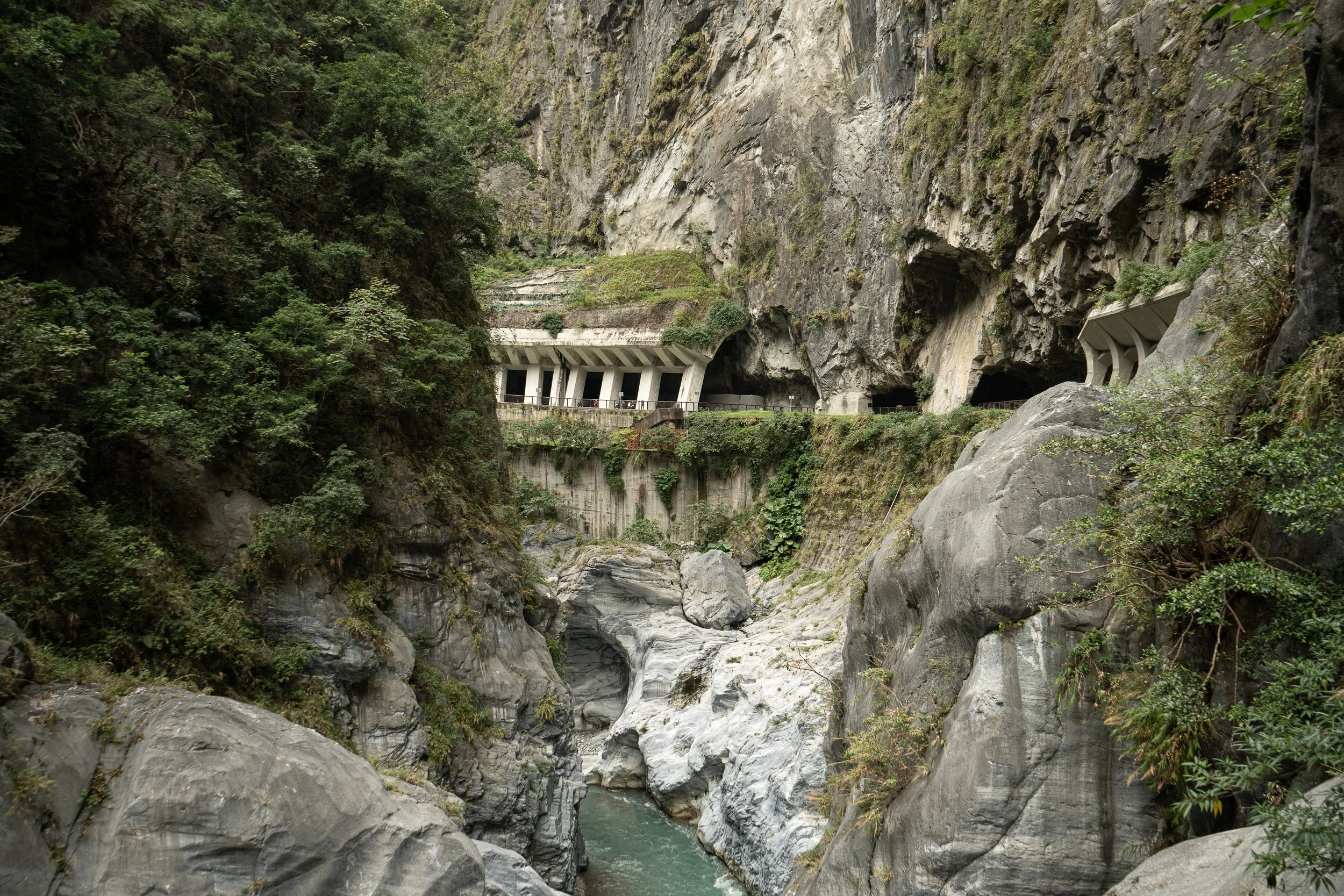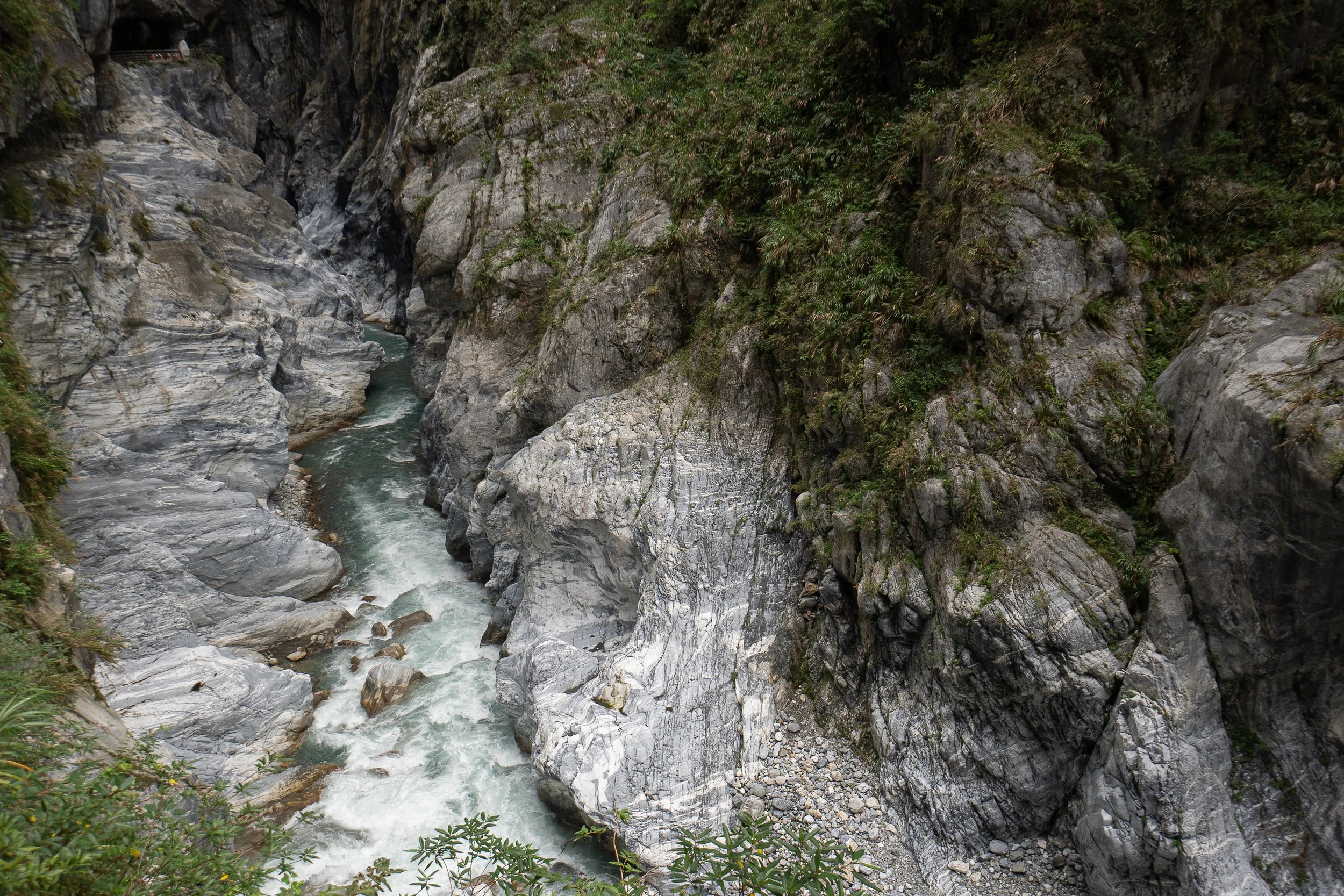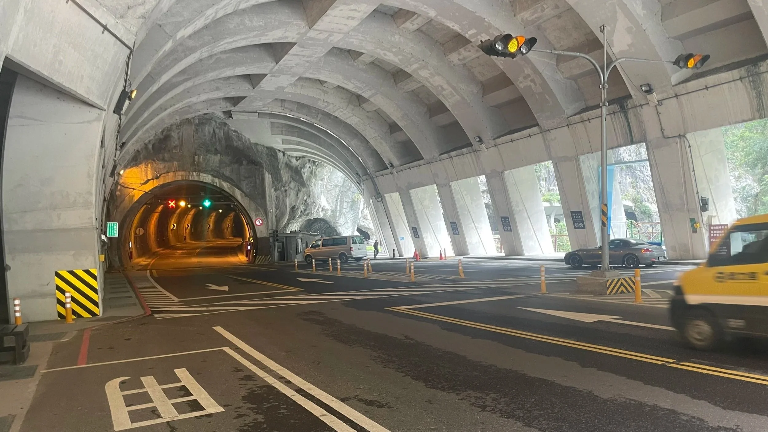 Vom Bahnhof nehme ich den ganz normalen Linienbus 302. Und schon allein die Busfahrt hinein, stromaufwärts am Liwu River entlang, ist spektakulär. Die Straße windet sich immer tiefer in die Schlucht, es geht dabei auch durch unzählige Tunnel und enge Kurven und immer wieder öffnen sich sagenhafte Blicke steil hinunter auf das türkisblau des Flusses, in Kontrast stehend zum weißen Marmor der Steilwände, die ihres Gleichen suchen. Ja, Taroko ist wirklich klasse und das hier ist die vielleicht spektakulärste Linienbusfahrt meines Lebens! Ich bin fast ein wenig enttäuscht, dass die Reise nach etwa 30 Minuten vorbei ist, ich steige aus an der zentralen Bushaltestelle, die in einer riesigen Felshöhle liegt, und begebe mich auf den "Tunnel of Nine Turns" Trail.Bushaltestelle Taroko: Halb Höhle, halb Schnellstraße, viel Berg und etwas Schlucht