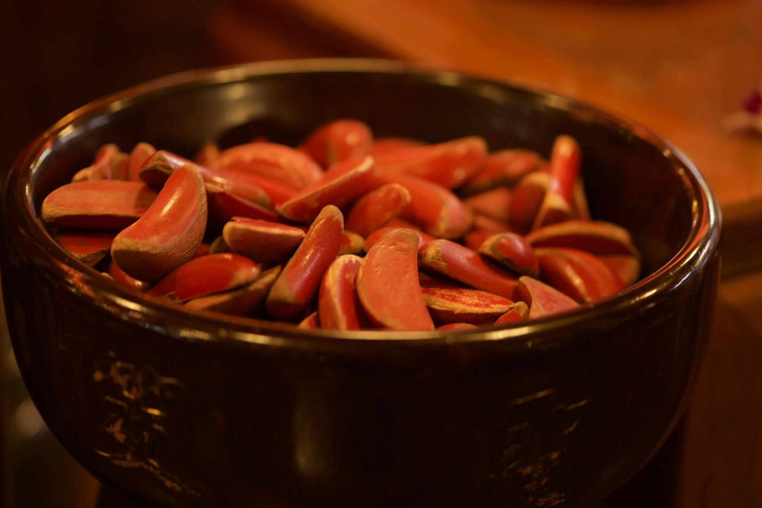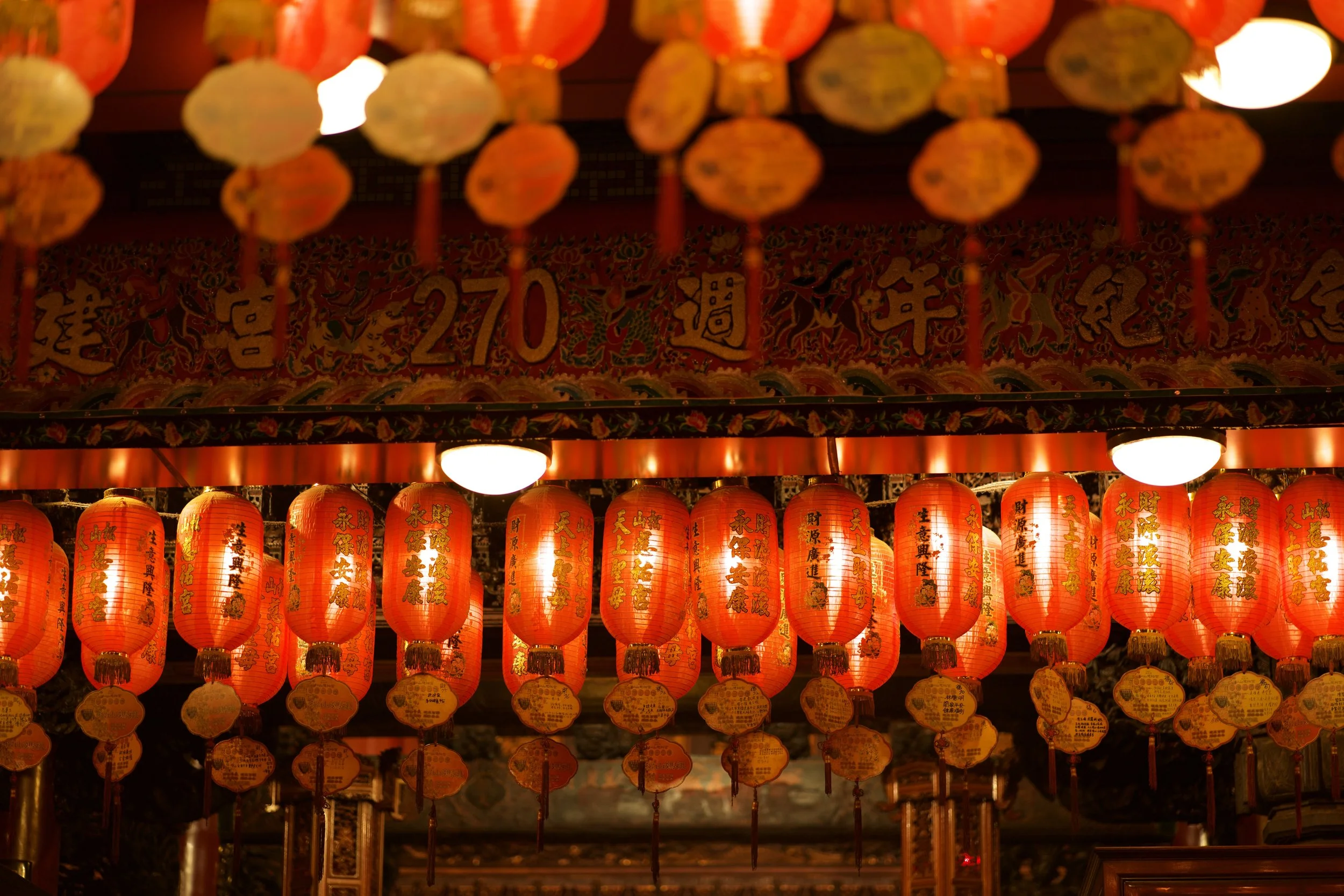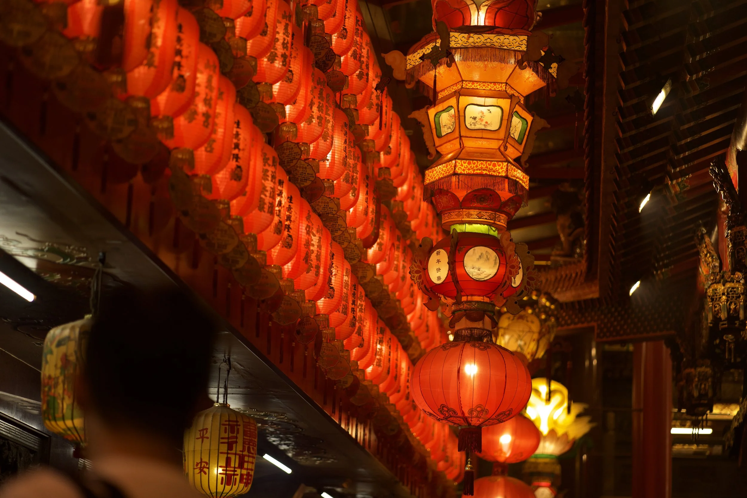 Ich starte starte mit dem Longshan Tempel, mit seinen reich verzierte Dächern, Drachenfiguren und diesen ganzen Laternen. Tatsächlich ist er einer der ältesten und bekanntesten Tempel Taiwans. Er wurde 1738 von chinesischen Einwanderern erbaut und ist vor allem der Göttin der Barmherzigkeit gewidmet. Der Longshan verbindet buddhistische, taoistische und volkstümliche Glaubensrichtungen und ist bis heute ein lebendiger Ort des Gebets, nicht nur eine Touristenattraktion.Und natürlich finde ich hier auch eine große Schale mit rot lackierten Holzstückchen, die wie kleine Bananen aussehen. Ich kenne diese Bananen, die eigentlich "Mondblöcke" heißen. Sie dienen den Gläubigen zur Befragung von Gottheiten, also der direkten Kommunikation mit einer spirituellen Instanz im Jenseits.