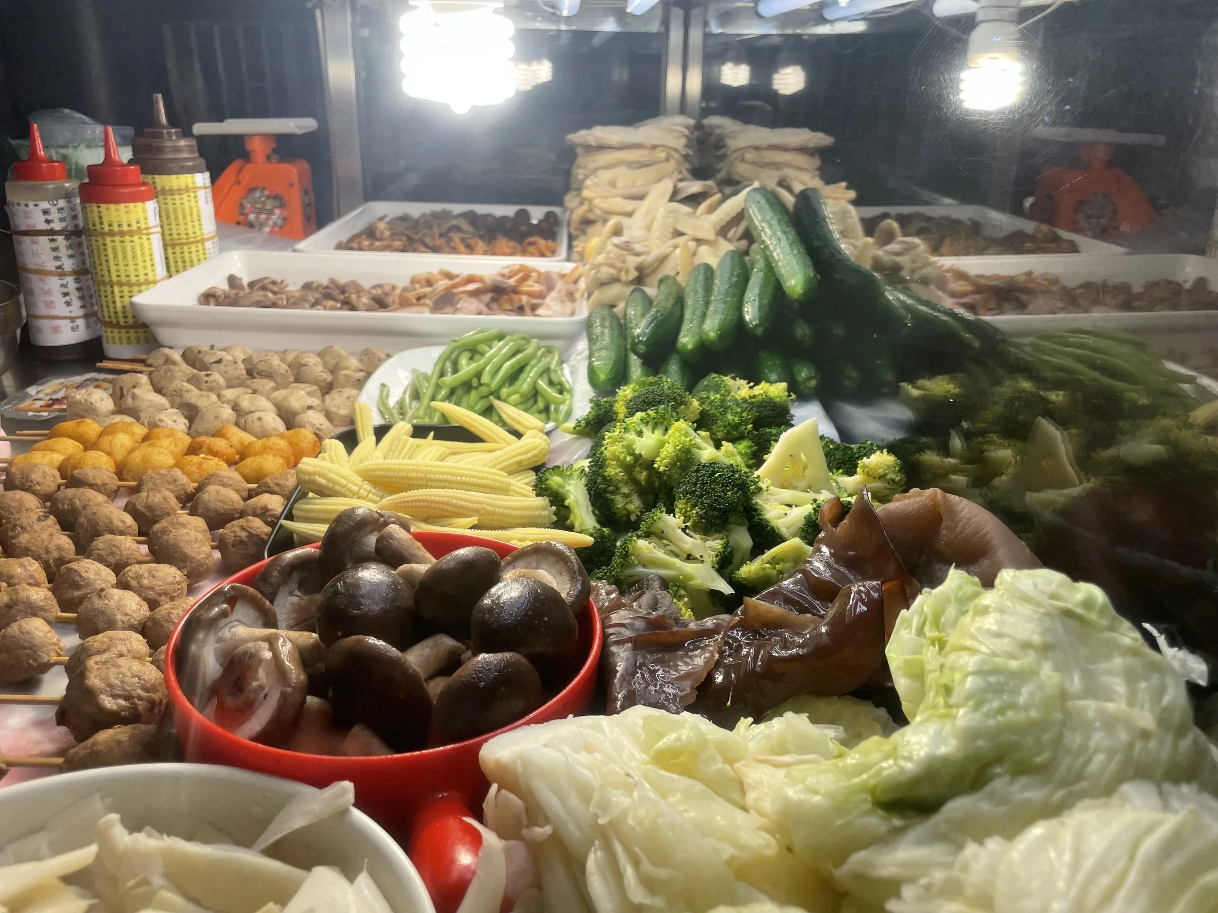 Vieles in Taiwan wirkt chinesisch, natürlich, aber auch etwas japanisch und manchmal gar irgendwie europäisch. Der Mix ist aufregend und macht mir immer sehr viel Spaß. Hier auf dem Night Market in Hualien, so fühlt es sich an, kommt wieder mal alles zusammen. Ich schlendere weiter und kehre ein paar Stände neben diesem spektakulären Gemüse-Stand in eine Garküche ein. Ich setze mich auf einen klapprigen Plastikstuhl in eine Art Food Court, der mit Zeltplanen vor dem Regen geschützt wird.
