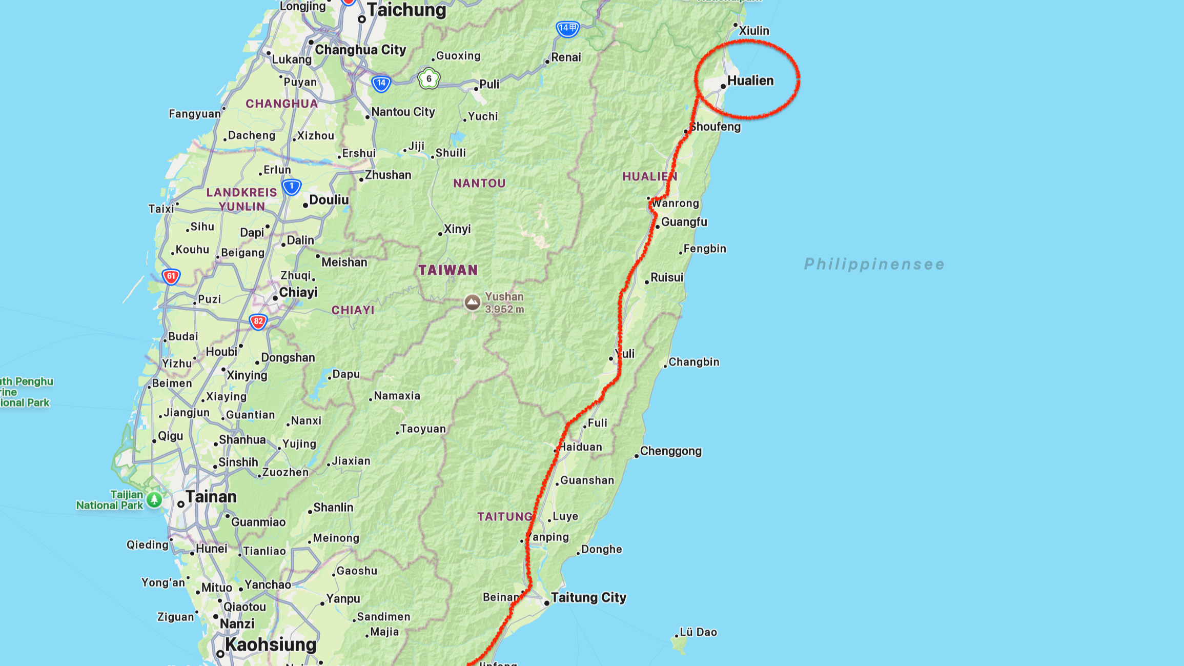 Schnitt. Zurück ins Hier-und-jetzt. Und ganz ohne Schnaps: Mein erster Stopp nach knapp vierstündiger, sehr angenehmer Zugfahrt ist schließlich die Kleinstadt Hualien, in der Nähe der spektakulären Taroko-Schlucht gelegen, 110.000 Einwohner.Auf der linken Seite die Bergketten, auf der rechten das Meer: vielseitiges Taiwan!