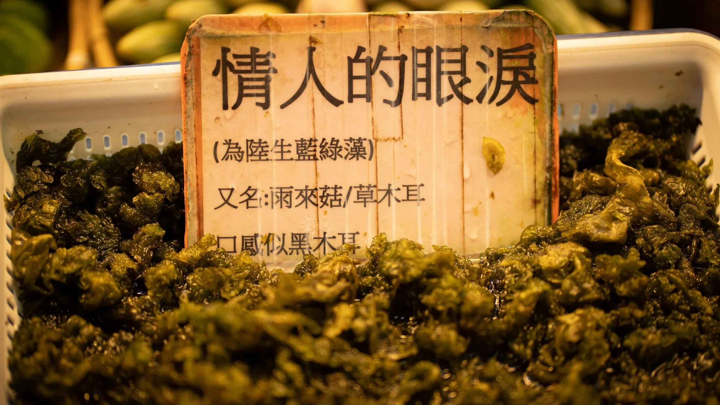 Ich recherchiere etwas. Und tatsächlich: Diese Blaualgen (Cyanobakterien-Alge) sind biologisch verwandt mit den gefährlichen Blaualgen aus den deutschen Seen und sie werden hier in Taiwan gerne gegessen: mariniert oder kurz angebraten, als Beilage zu Reis. Der Geschmack soll mild sein, leicht erdig und die Textur glitschig-knackig.