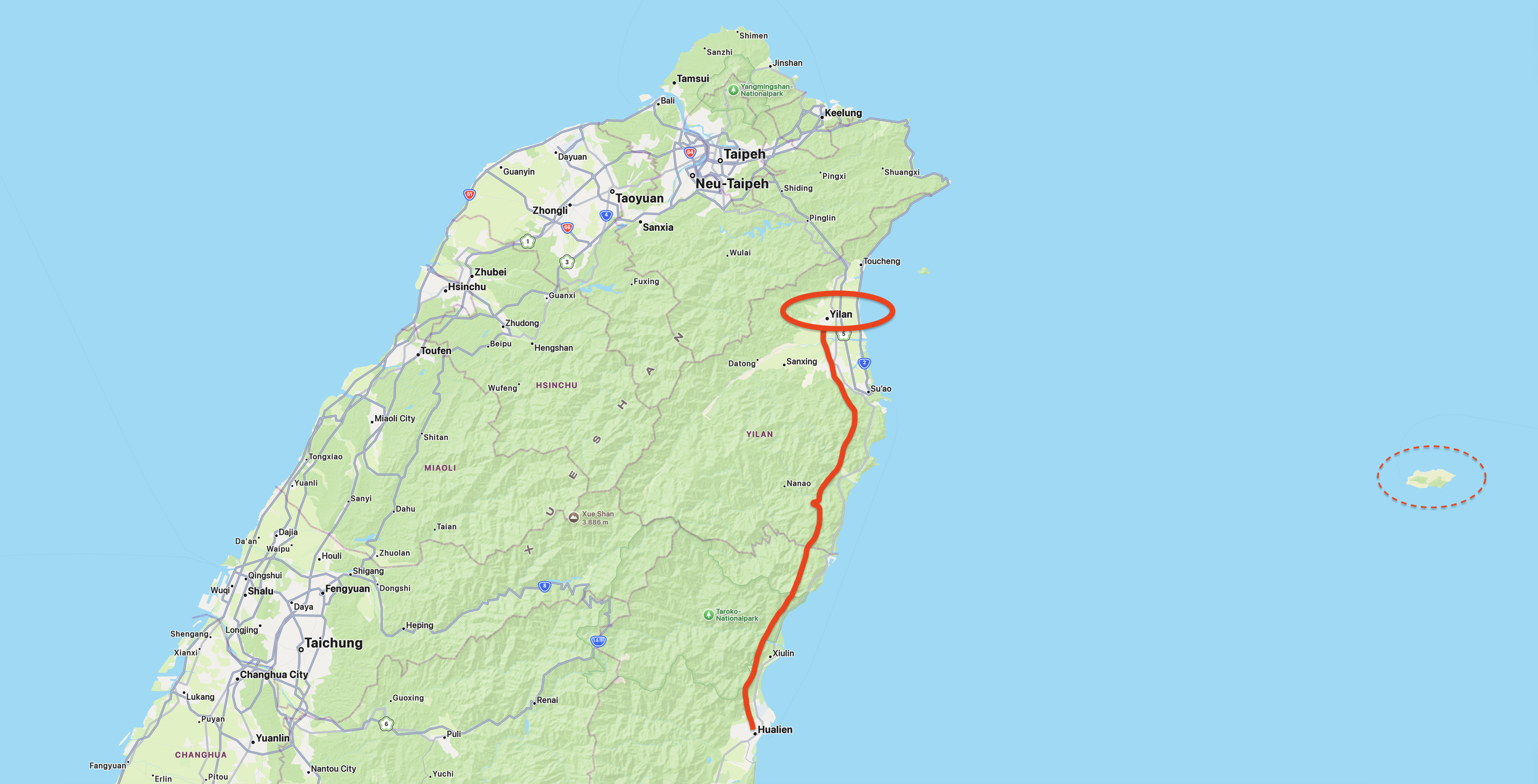 Im Taroko Nationalpark gibt es auch echte Trails, zum richtigen Wandern, für ein paar benötigt man sogar eine Genehmigung, bei einigen besteht Helmpflicht. Wenn ich mir die steilen Felswände so anschaue, macht das sicherlich Sinn.Den ein oder anderen spannenden Trail hatte ich mir vorgenommen, allerdings schüttete es die letzten Tage wie aus Eimern und so entschied ich mich gegen diese Abenteuer und blieb stattdessen in der Stadt. Einige Trails waren sogar aufgrund des Wetters gesperrt. Und nun, am Tag meiner Abreise aus Hualien, ist das Wetter zwar endlich besser, aber da ich heute noch weiter reisen möchte, wähle ich die kleine Variante, schaue mir lediglich den leicht zugänglichen Teil der Schlucht an und den "Schrein des ewigen Frühlings", den Changchun Shrine, mit seinem schicken Wasserfall.Der Besuch der Taroko-Schlucht jund des Tempels ist ein sehr guter Abschluss meiner Zeit in Hualien. Aus den Bergen geht es mit dem Bus zurück, direkt zum Bahnhof, wo mein schwerer Reiserucksack im Schließfach wartet. Auf geht's, weiter mit dem Zug, weiter die Küste hinauf, nach Norden!Zugfahrt Hualien nach Yilan: Fast in Sichtweite die Insel Yonaguni - die westlichste Insel Japans.